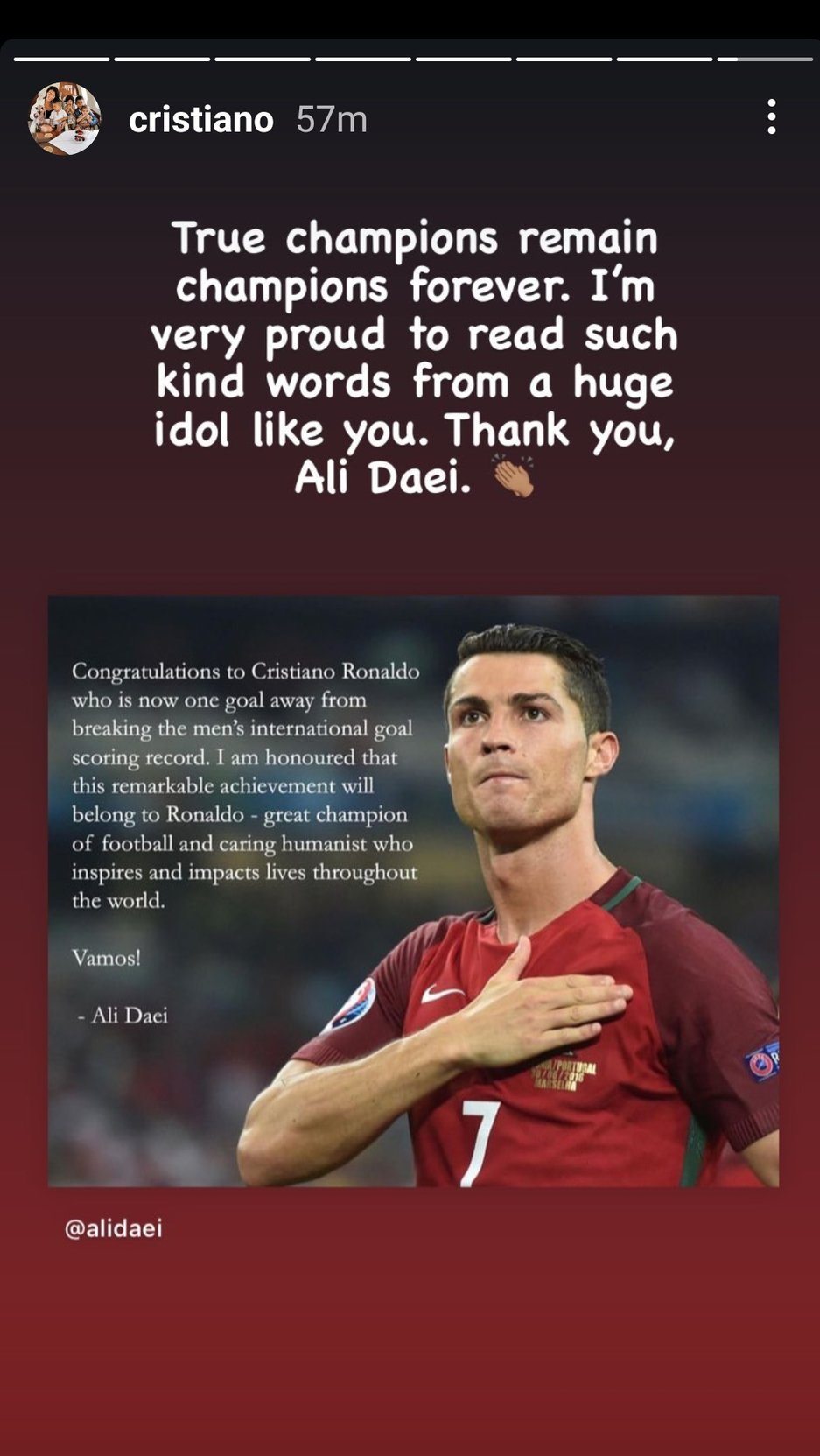 In a post on Instagram Daei said he was honoured that his record would eventually pass to a great champion of football. Former Iran international Ali Daei later took to Instagram to congratulate the Portuguese talisman for becoming the joint-top scoring mens international player of all time and said he is happy that the record will belong to great champion of football in the future. View this post on Instagram A post shared by Ali Daei alidaei.